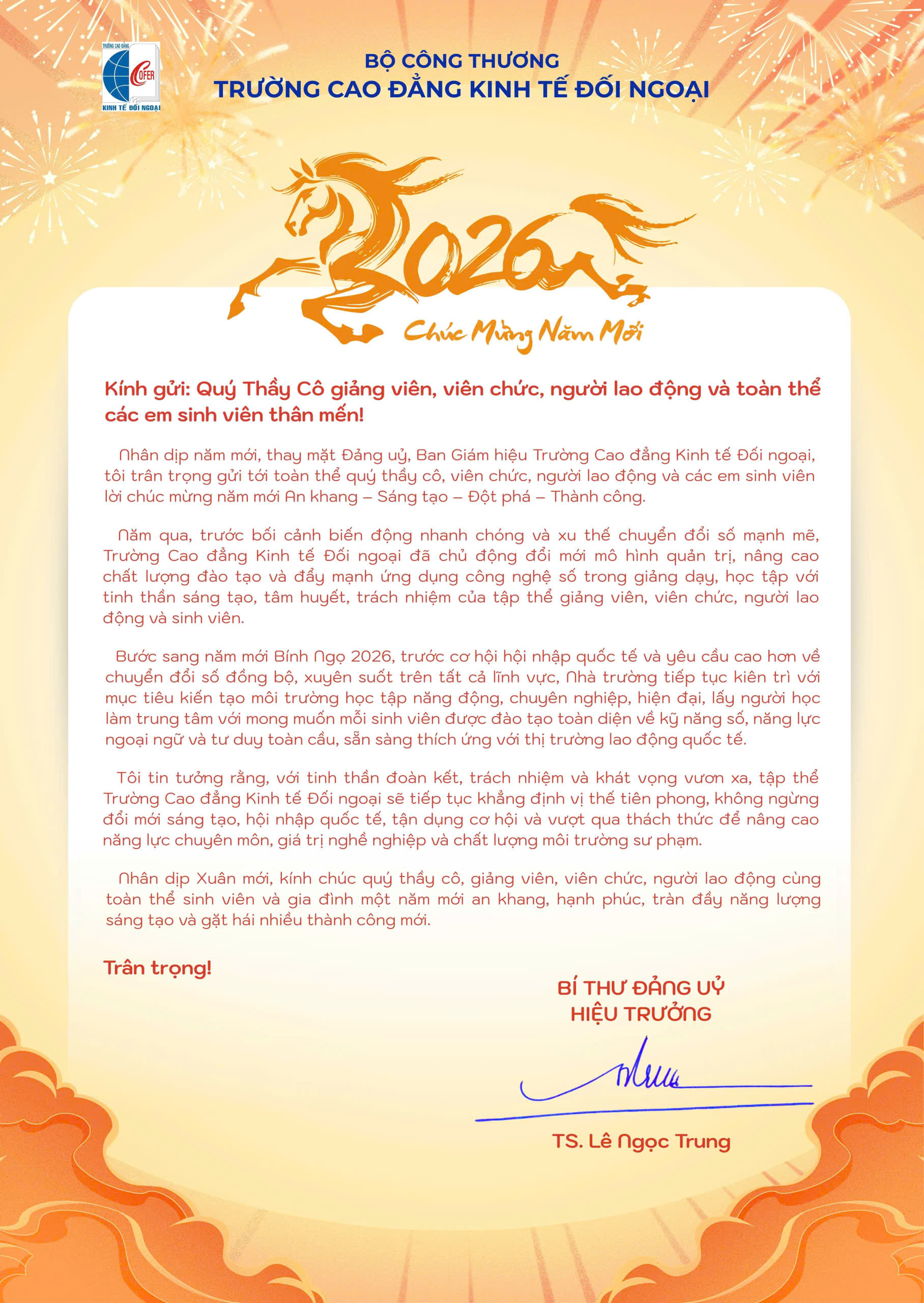 - Trường Cao đẳng Kinh tế Đối ngoại long trọng tổ chức Lễ Khai giảng năm học 2025-2026 và Chương trình Chào đón Tân sinh viên Khóa 29: COFER – A NEW CHAPTER - 08/09/2025