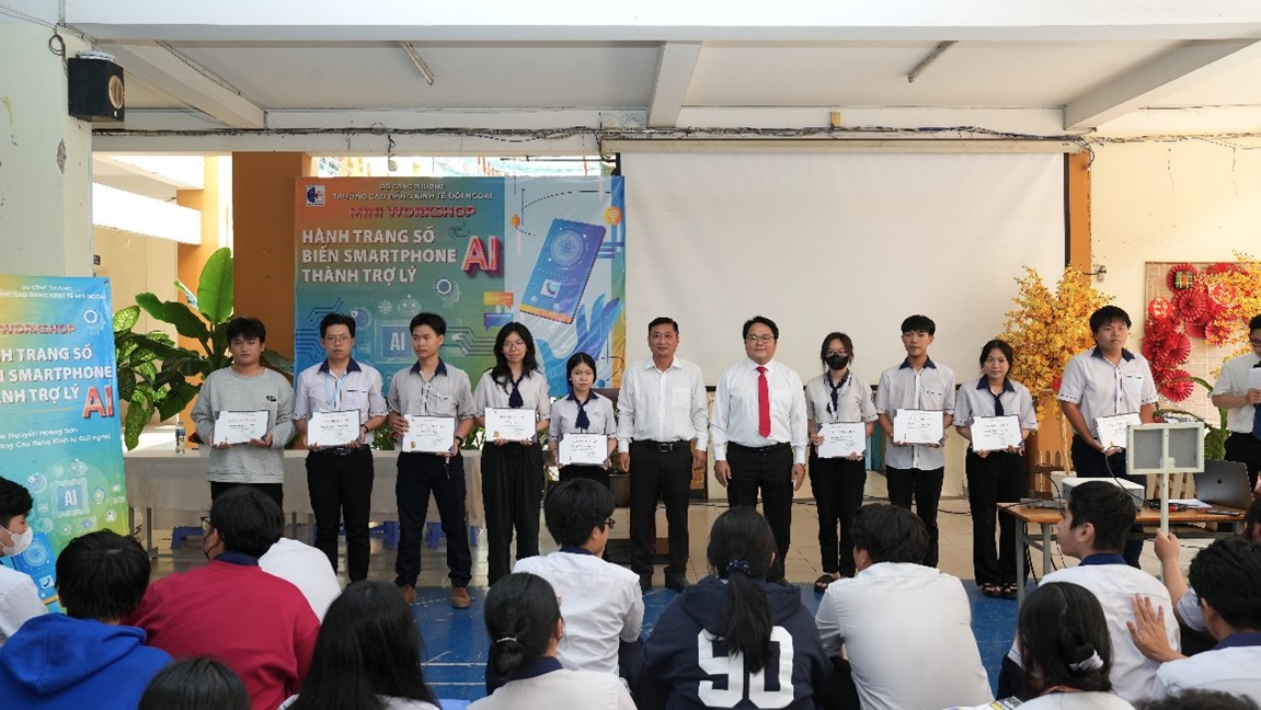 Cũng trong buổi workshop, đại diện Ban Giám hiệu Trường Cao đẳng Kinh tế Đối ngoại cũng đã trao bằng Chứng nhận hoàn thành lớp bồi dưỡng kiến thức “Hành trang số- Biến smartphone thành trợ lý hoc tập AI” cho gần 500 em học sinh trong tinh thần động viên và khuyến khích các bạn học tập sáng tạo, hiệu quả.